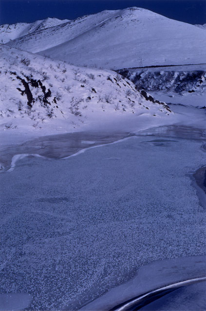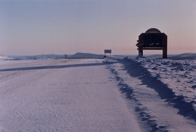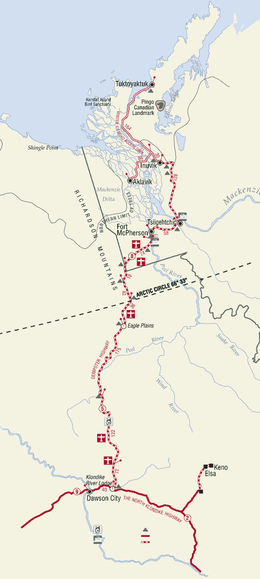 On March 23, 2002, a friend and I flew from Vancouver, British Columbia, to Whitehorse, Yukon Territory. We then spent the next week on a road trip from Whitehorse to Tukoyaktuk, Northwest Territories, on the Arctic Coast. March is still the end of winter up there, and the last 160 km (100 miles) were on the frozen Mackenzie River Delta and Arctic Ocean. Here's a map of the Dempster Highway and ice road.